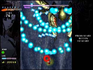Besides the script and plot, there is also some other stuff to this game, like graphics, music, and gameplay. The graphics are nice but this game is a shooter so graphics aren’t all that important, unless they manage to hinder the gameplay. Too bad this games graphics do hinder the gameplay. The bullets come in multiple colors and have different properties (green bullets, for example, can be destroyed) but some bullets are very hard to see against the game’s background. It may have been a design decision they went with on purpose, in which case they were lazy. Deriving challenge from cheap crap like not being able to see the bullets is a sign the designers just gave up. The graphics of your ships firepower also make enemy bullets and ships very hard to see at times. This appears to have been another conscious design decision by Alfa System. I can tolerate it a little better than not being able to see enemy bullets due to the background because the decision of when to shoot is the players but it still seems like a pretty lame way to make the game harder.
